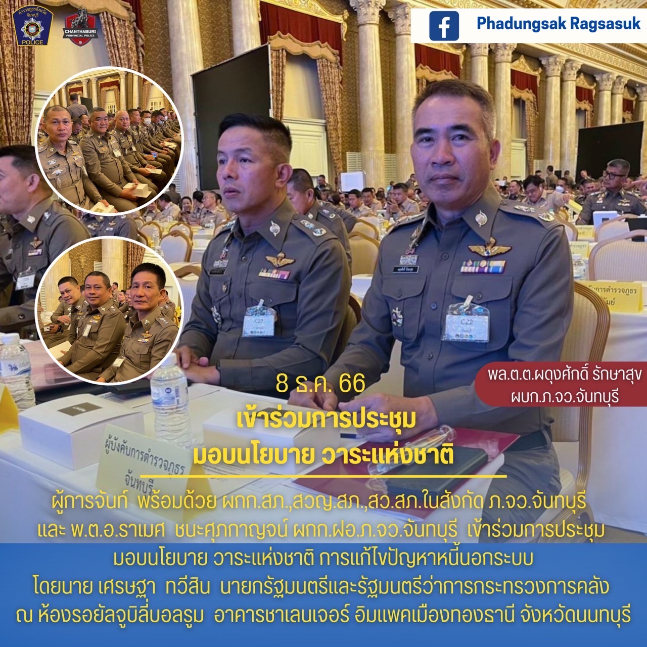 พล.ต.ต.ผดุงศักดิ์ รักษาสุข ผบก.ภ.จว.จันทบุรี พร้อมด้วย ผกก.สภ.,สวญ.สภ.,สว.สภ.ในสังกัด ภ.จว.จันทบุรี และ พ.ต.อ.ราเมศ ชนะศุภกาญจน์ ผกก.ฝอ.ภ.จว.จันทบุรี เข้าร่วมการประชุมมอบนโยบายวาระแห่งชาติ การแก้ไขปัญหาหนี้นอกระบบ โดยนาย เศรษฐา ทวีสิน นายกรัฐมนตรีและรัฐมนตรีว่าการกระทรวงการคลัง