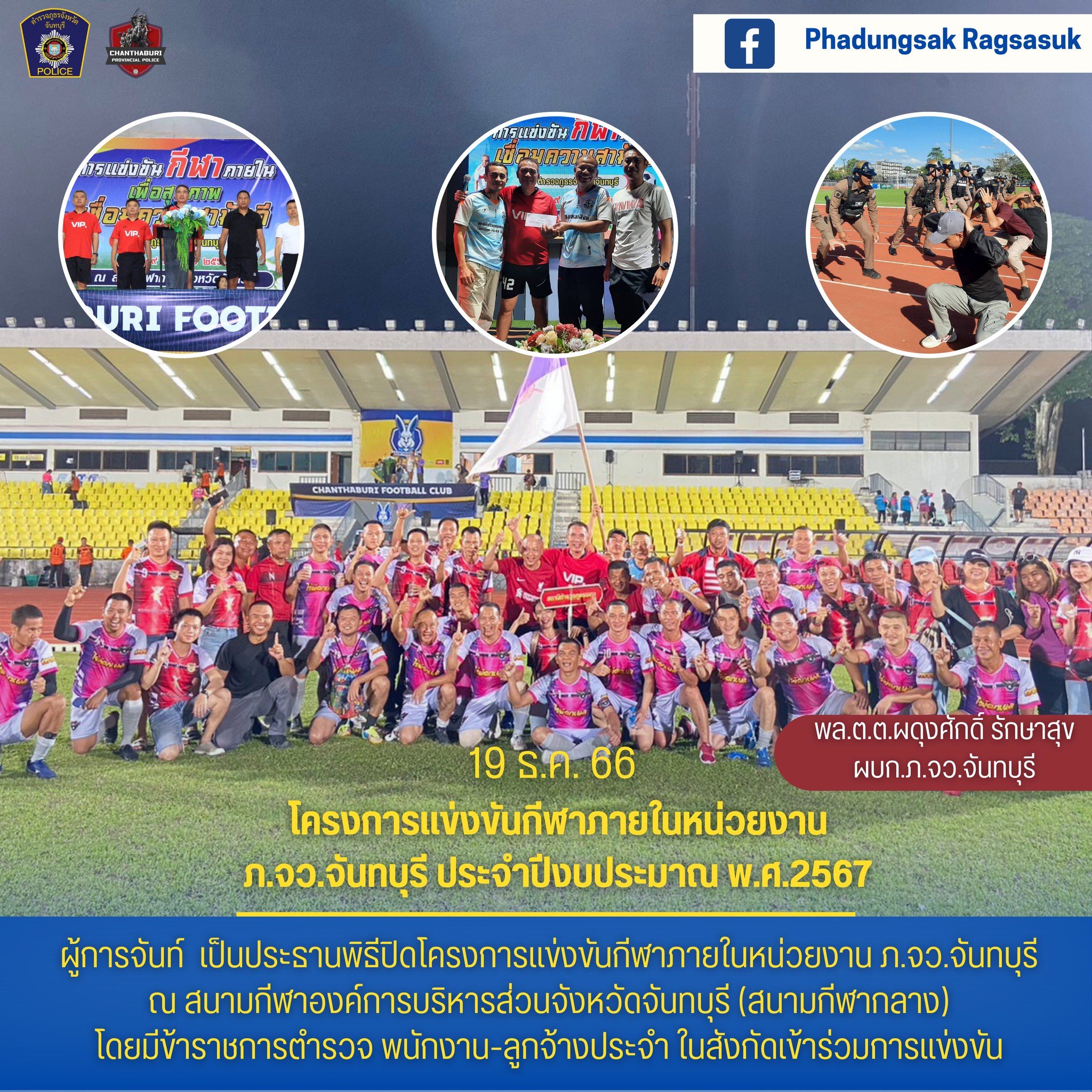 ตำรวจภูธรจังหวัดจันทบุรี นำโดย พล.ต.ต.ผดุงศักดิ์ รักษาสุข ผบก.ภ.จว.จันทบุรี จัดกิจกรรมแข่งขันกีฬาภายในเพื่อเชื่อมความสามัคคีของข้าราชการตำรวจในสังกัด ภ.จว.จันทบุรี โดยมีข้าราชการตำรวจ พนักงาน ลูกจ้าง และครอบครัวตำรวจ เข้าร่วมการแข่งขัน ประกอบด้วย