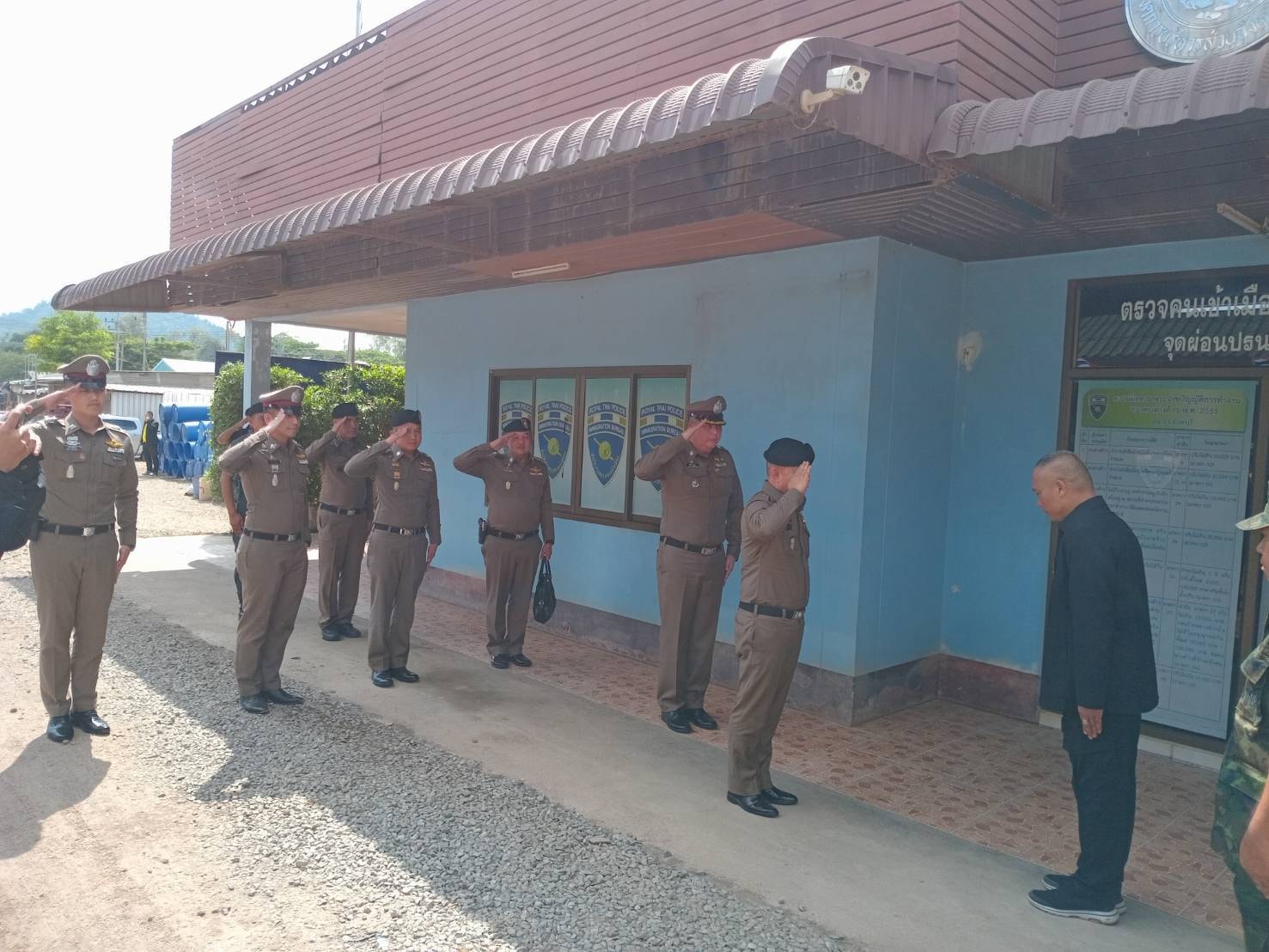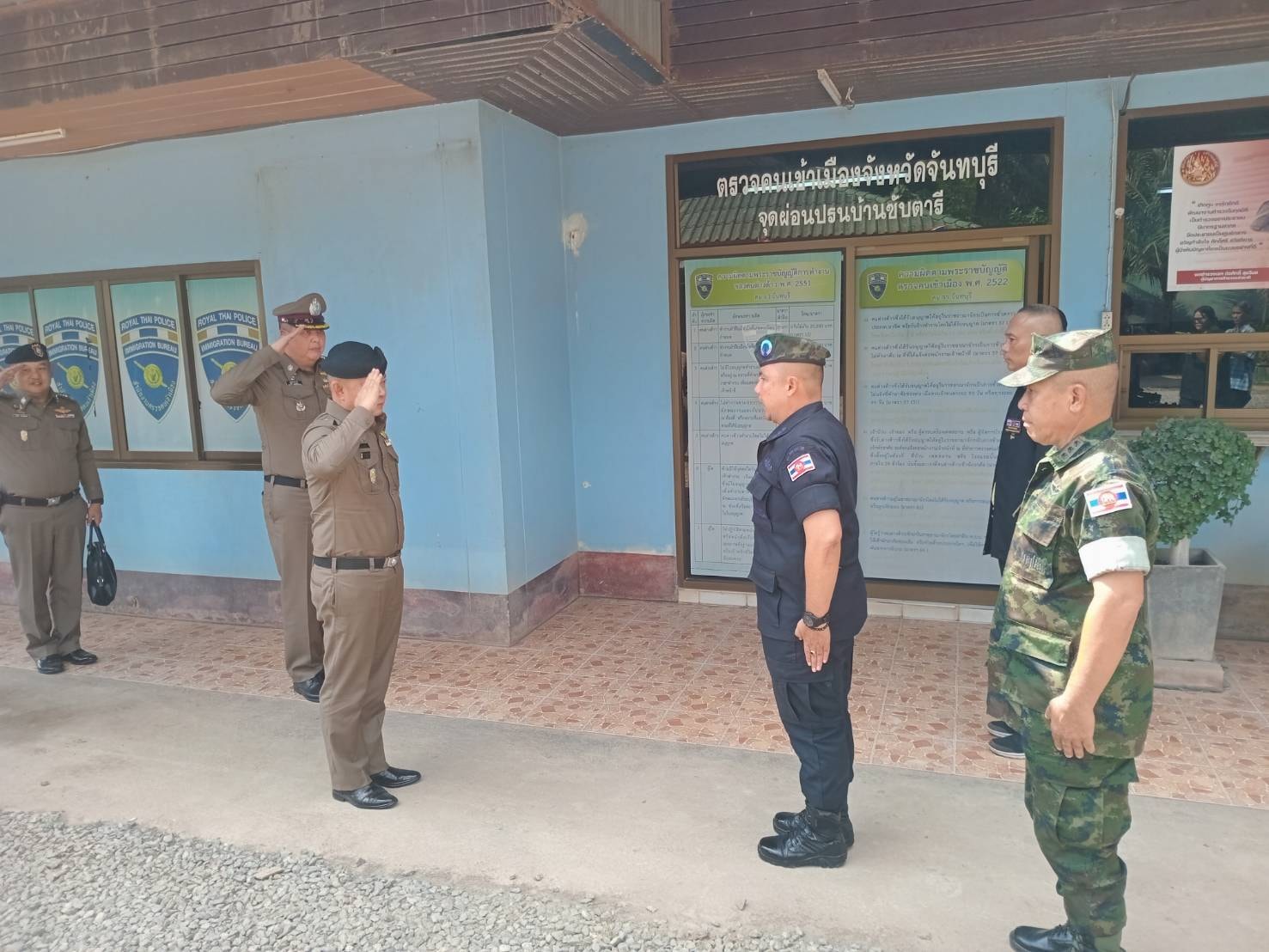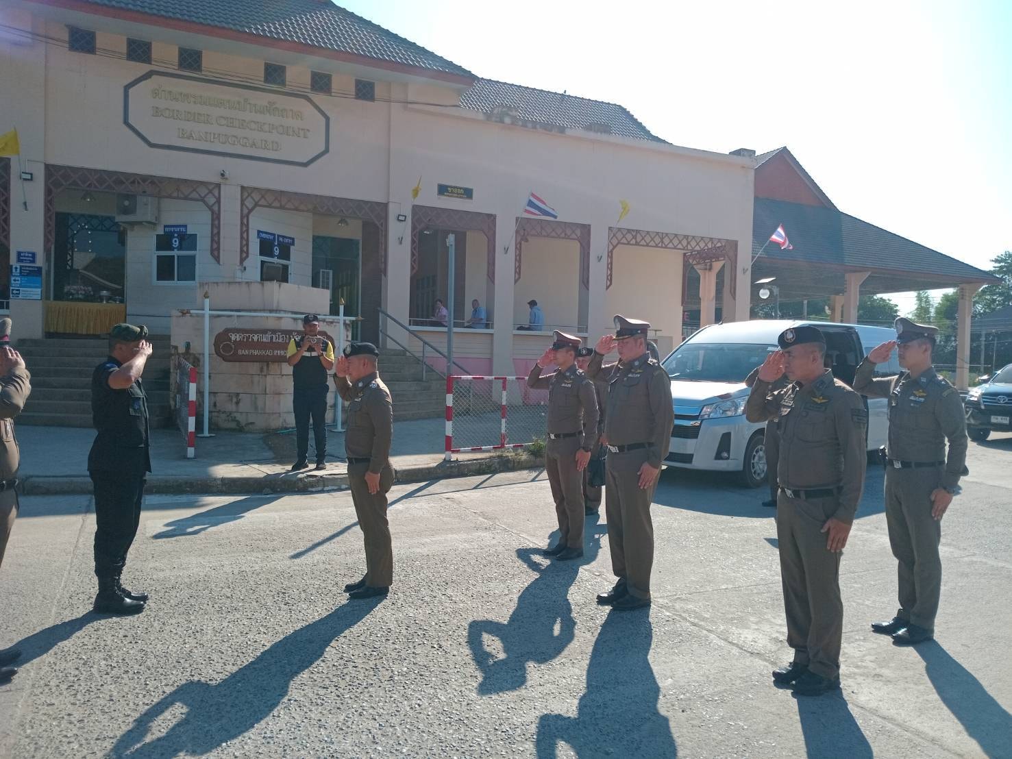 วันที่ 3 เม.ย.67 เวลา 14.30 น. พล.ต.ต.ผดุงศักดิ์ รักษาสุข ผบก.ภ.จว.จันทบุรี ร่วมให้การต้อนรับ พล.ต.อ.ธนา ชูวงศ์ รอง ผบ.ตร. รับผิดชอบกำกับการบริหารราชการ รวมทั้งสั่งและปฏิบัติราชการแทน ผบ.ตร. ในงานศูนย์ปราบปรามคนร้ายข้ามชาติและเข้าเมืองโดยผิดกฏหมาย (ศปชก.ตร.) ได้มาตรวจเยี่ยมงานการปราบปรามคนร้ายข้ามชาติและเข้าเมืองโดยผิดกฏหมาย โดยมีผู้ร่วมรับการตรวจเยี่ยมประกอบด้วย พล.ต.ท.อิทธิพล อัจฉริยะประดิษฐ์ ผู้ช่วย ผบ.ตร., พล.ต.ต.ฉัตรชัย สุรเชษฐพงษ์ รอง ผบช.ภ.2, พล.ต.ต.ผดุงศักดิ์ รักษาสุข ผบก.ภ.จว.จันทบุรี, พ.ต.อ.วีรยศ การุณยธร รอง ผบก.ตม.2 รรท.ผกก.ตม.จว.จันทบุรี , พ.ต.อ.กมล โอศิริ ผกก.สภ.สะตอน, พ.ต.อ.พรชัย แช่มช้อย ผกก.ตชด.11 , ณ จุดผ่อนปรนบ้านซับตารี , ด่านถาวรบ้านแหลม , จุดผ่านแดนถาวรบ้านผักกาด อ.สอยดาว จ.จันทบุรี