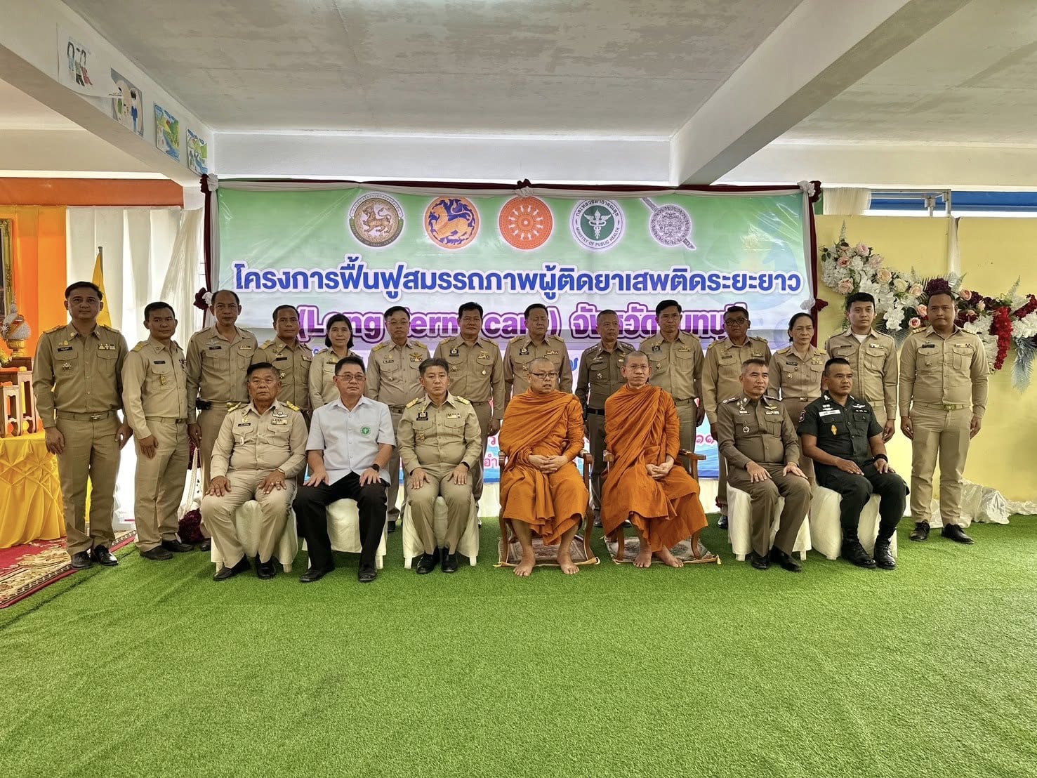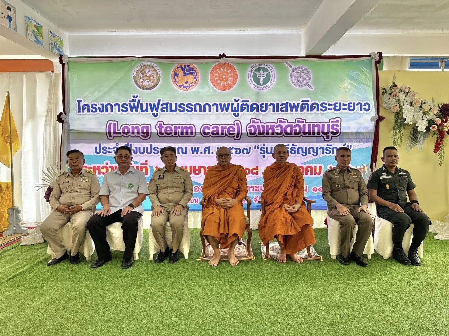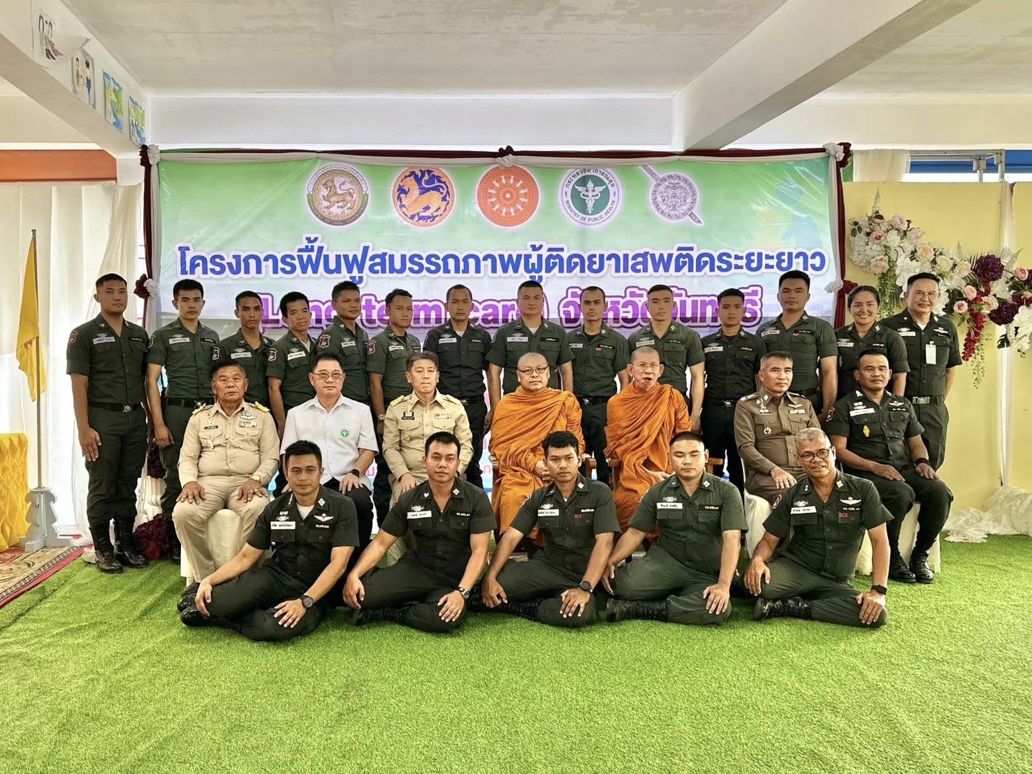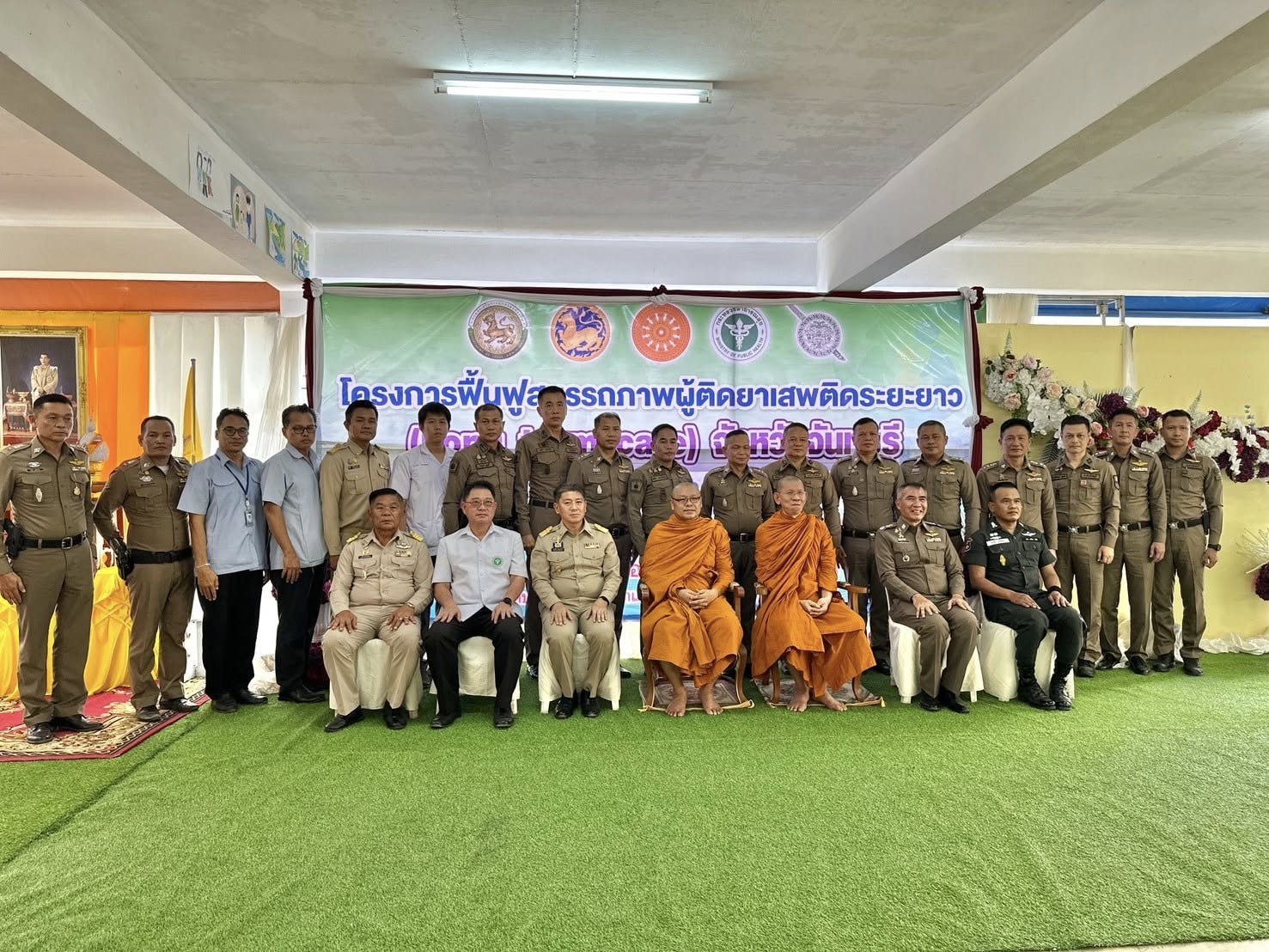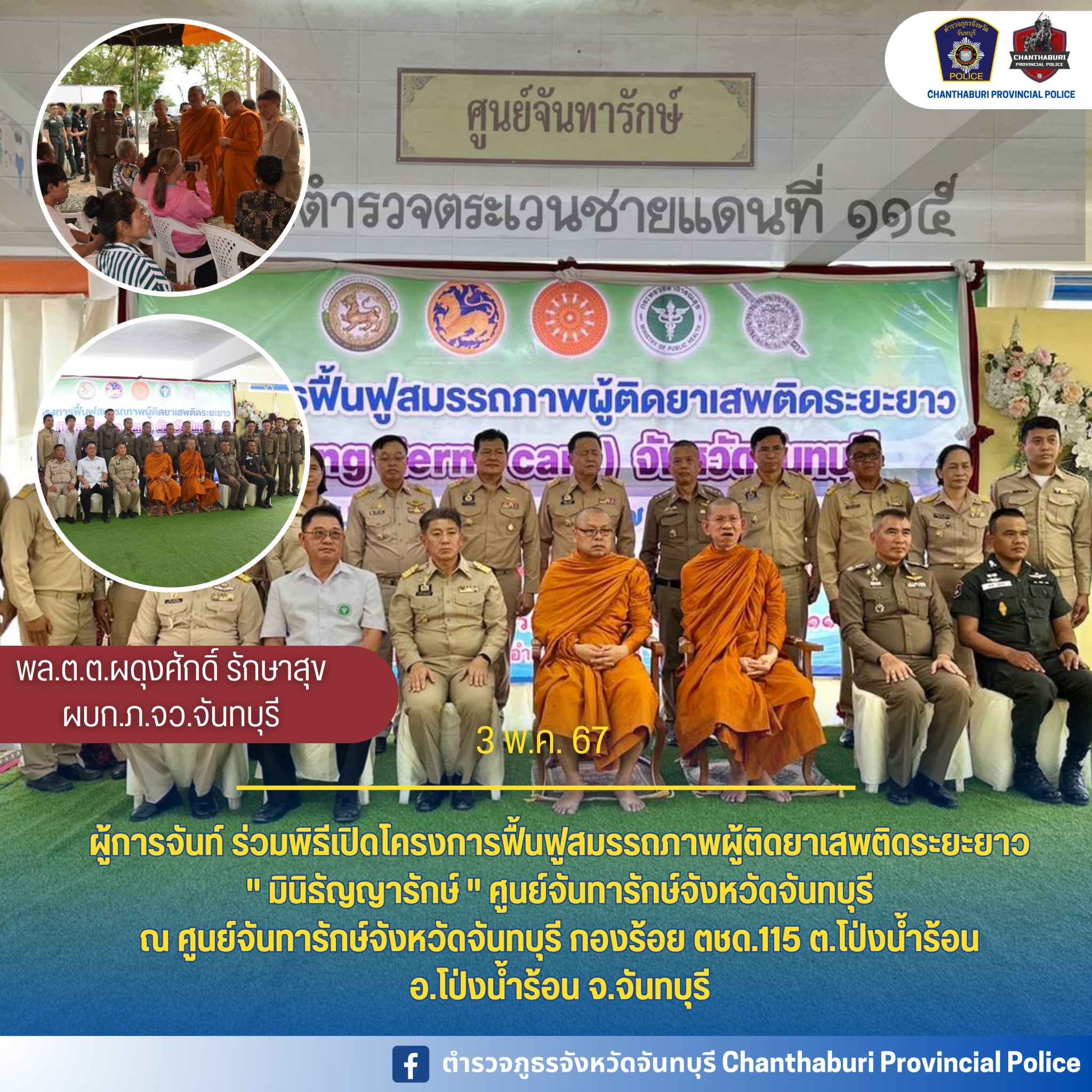 วันที่ 3 พ.ค.67 เวลา 13.30 น. พล.ต.ต.ผดุงศักดิ์ รักษาสุข ผบก.ภ.จว.จันทบุรี, นายมนต์สิทธิ์ ไพศาลธนวัฒน์ ผู้ว่าราชการจังหวัดจันทบุรี, นายแพทย์อภิรักษ์ พิศุทธ์อาภรณ์ นายแพทย์สาธารณสุขจังหวัดจันทบุรี, นายวุฒิภากร จันทร์ทับ พัฒนาสังคมและความมั่นคงของมนุษย์จังหวัดจันทบุรี, พ.ต.อ.พรชัย แช่มช้อย ผบ.ร้อย ตชด.11, คุณทัชยา รักษาสุข ประธานแม่บ้านตำรวจภูธรจังหวัดจันทบุรี พร้อมด้วยเจ้าหน้าที่ทีม FAST, เจ้าหน้าที่ตำรวจ, ฝ่ายปกครองในจังหวัดจันทบุรี ร่วมพิธีเปิดโครงการฟื้นฟูสมรรถภาพผู้ติดยาเสพติดระยะยาว (Long term care) จังหวัดจันทบุรี โดยมีพระธรรมวชิรเมธี เจ้าคณะภาค 1 เจ้าอาวาสวัดหงส์รัตนาราม และพระราชธรรมเมธี เจ้าคณะจังหวัดจันทบุรี เป็นประธานเปิดโครงการดังกล่าว และได้ร่วมพูดคุยพบปะให้กำลังใจผู้ฟื้นฟูและญาติของผู้ฟื้นฟู ณ โอกาสนี้ด้วย ณ ศูนย์จันทารักษ์ กองร้อย ตชด.115 อ.โป่งน้ำร้อน จว.จันทบุรี