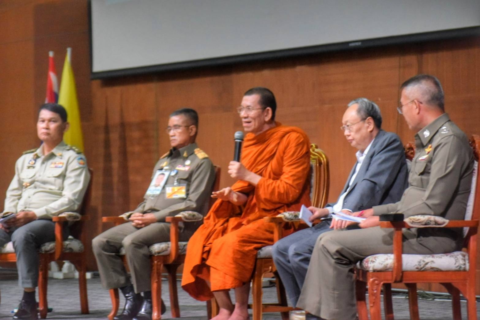 จากนั้น พระธรรมวชิรเมธี เจ้าอาวาสวัดหงส์รัตนาราม พร้อมด้วย พระราชธรรมเมธี เจ้าคณะจังหวัดจันทบุรี , พล.อ.เฉลิมชัย สิทธิสาท องคมนตรี , นายมนต์สิทธิ์ ไพศาลธนวัฒน์ ผวจ.จันทบุรี และ พล.ต.ต.ผดุงศักดิ์ รักษาสุข ผบก.ภ.จว.จันทบุรี ได้มอบกรมธรรม์ประกันชีวิตให้กับอาสาสมัครฯ