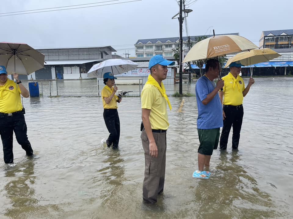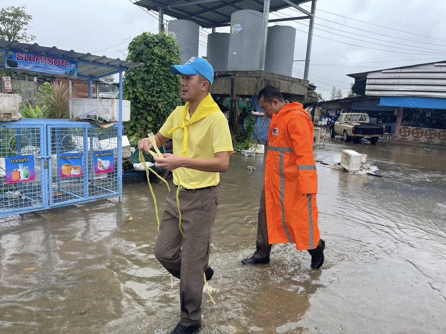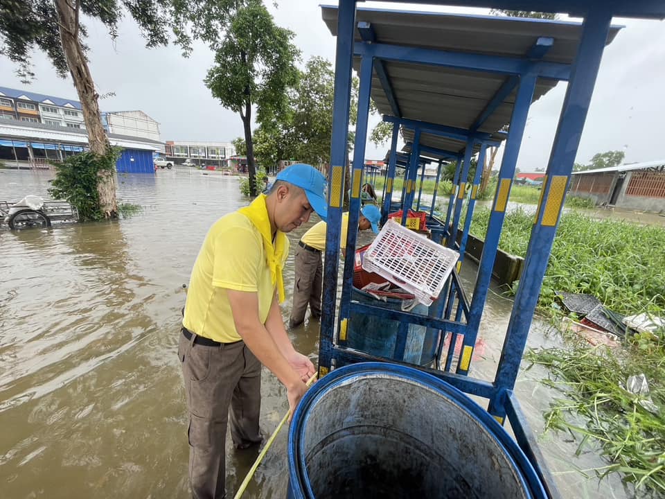 ว.4 ตรวจการจราจรบริเวณตลาดเจริญสุข มีน้ำท่วมขังและ เก็บขยะที่อุดตันบริเวณปากท่อระบายน้ำ เพื่อให้น้ำได้ระบายได้อย่างเต็มที่