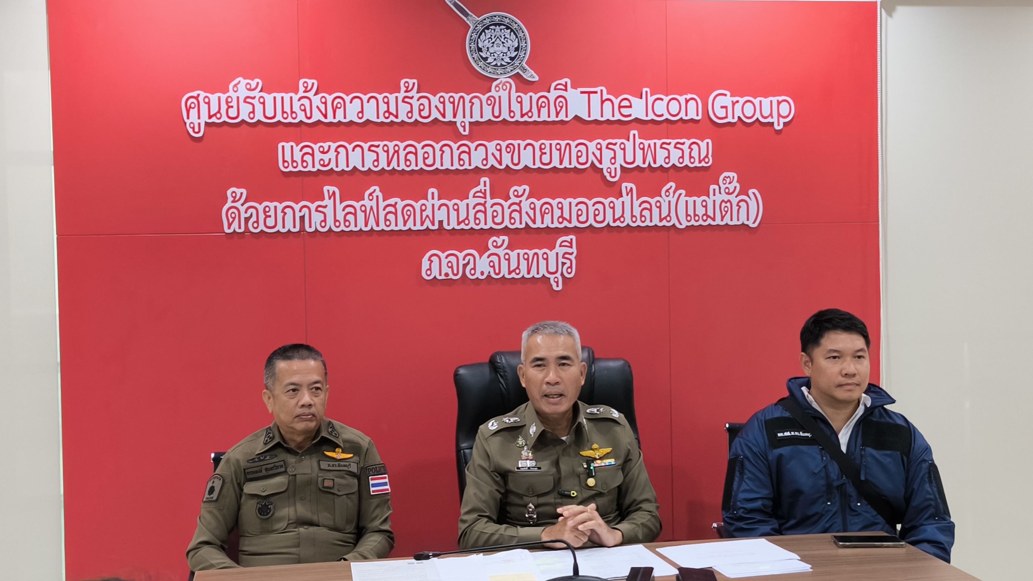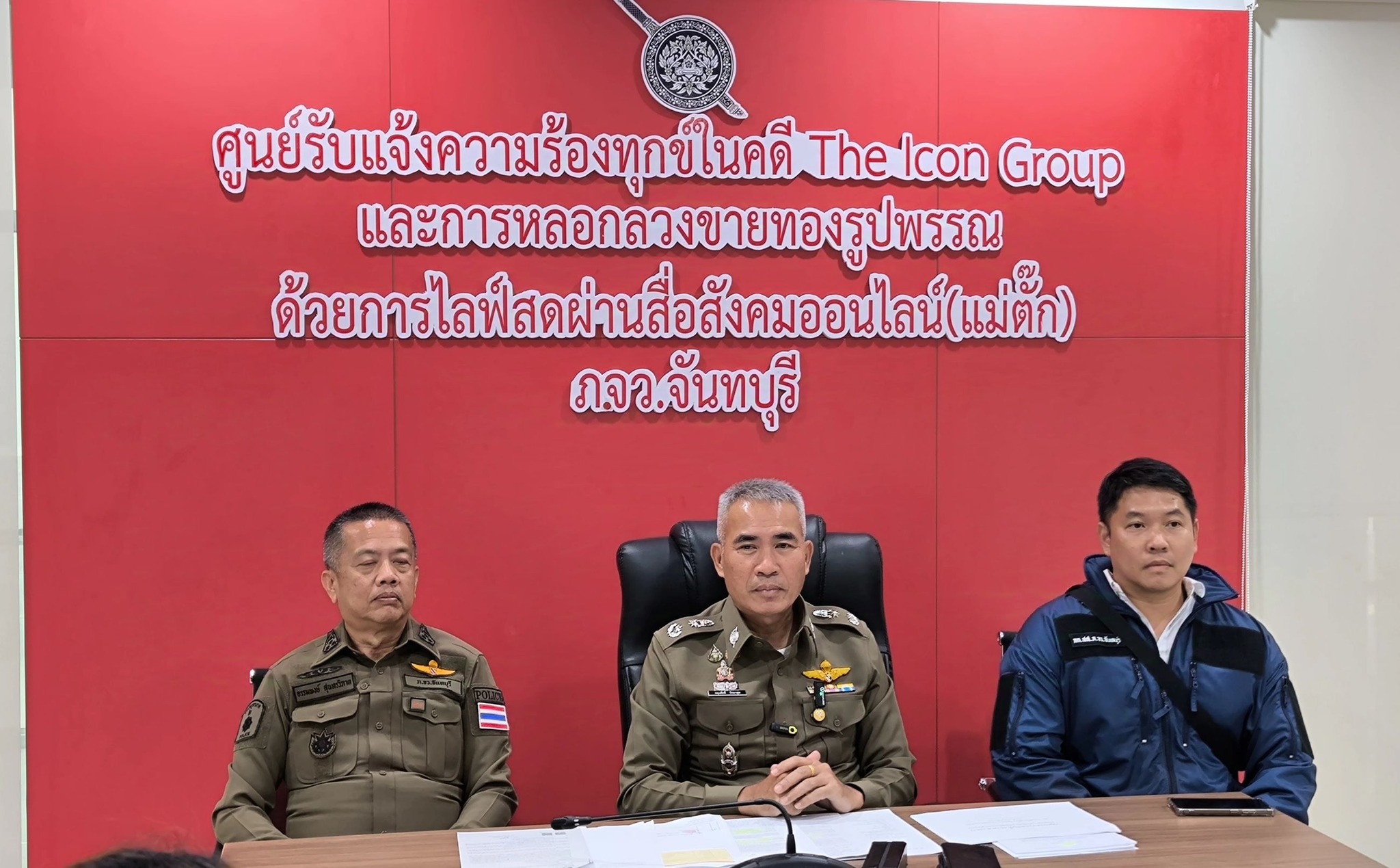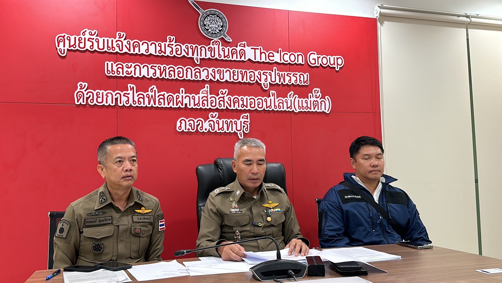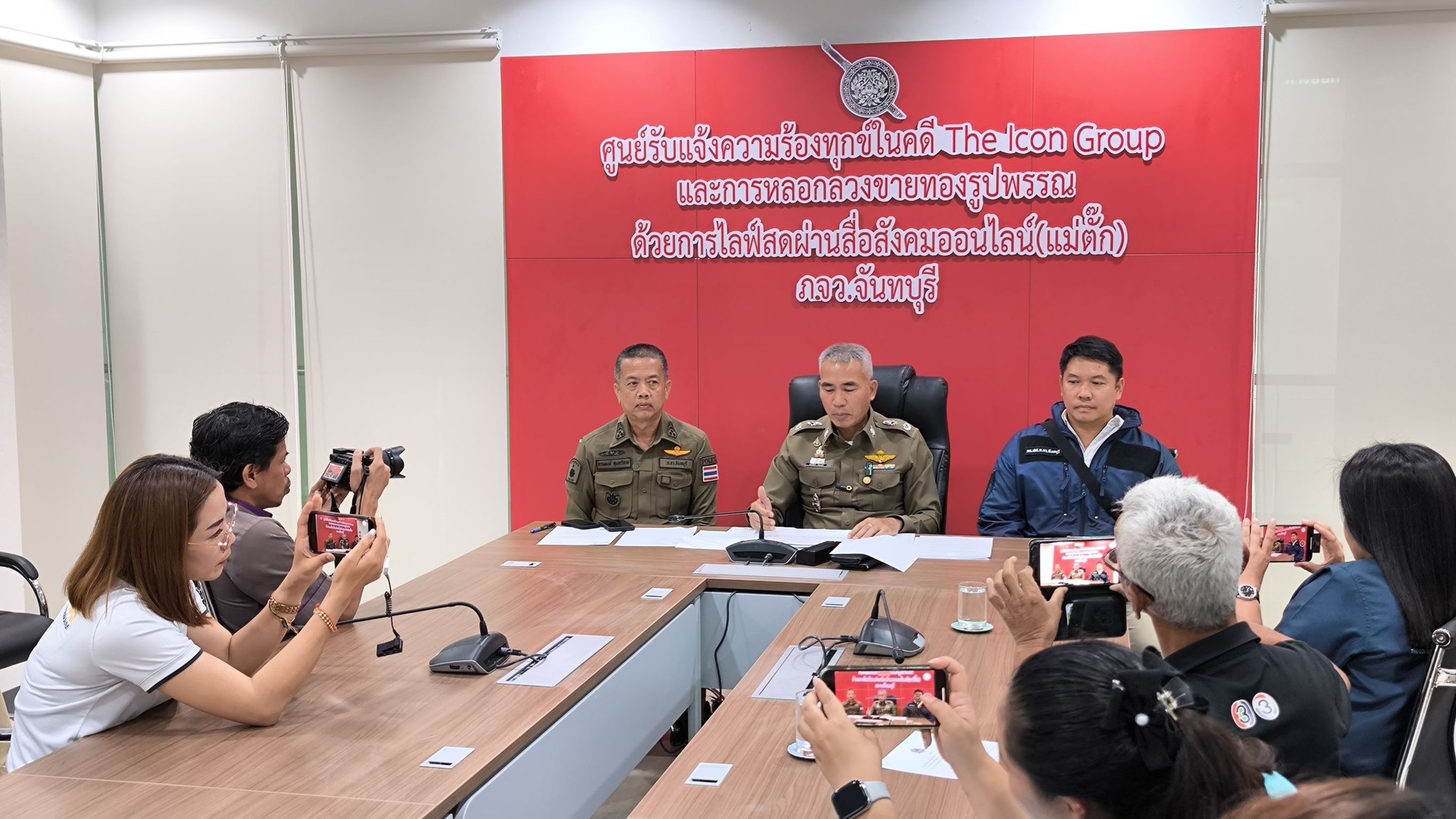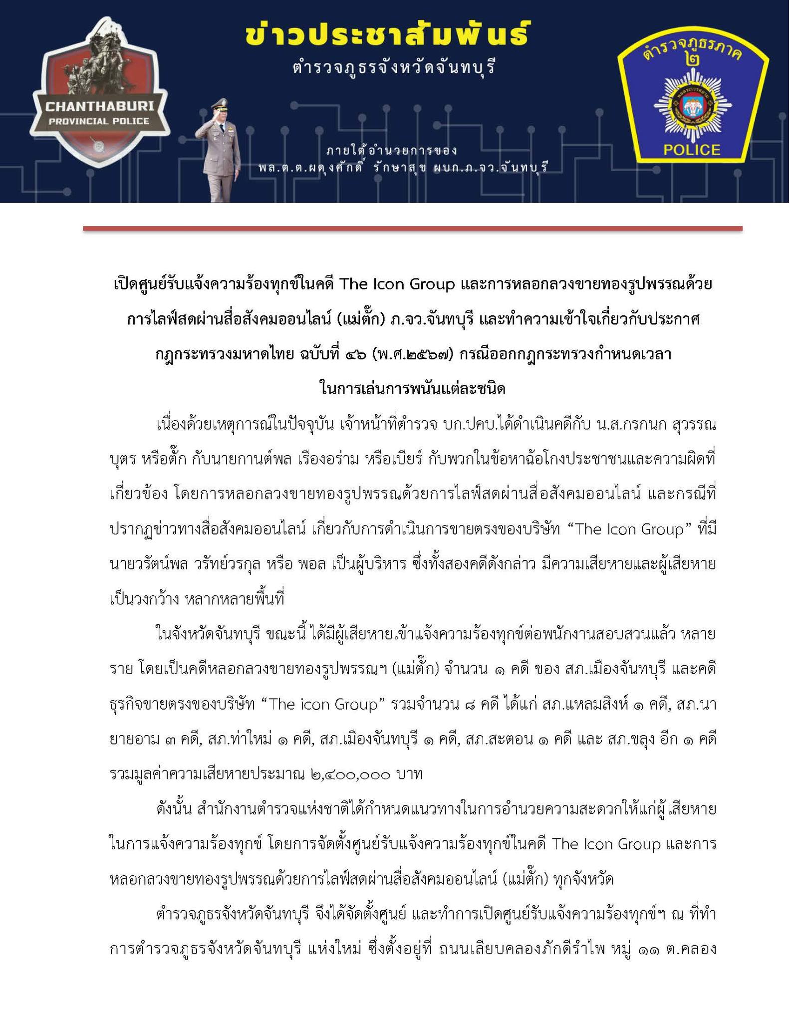 ณ ที่ทำการ ภ.จว.จันทบุรีแห่งใหม่ เวลา 15.00 น. พล.ต.ต.ผดุงศักดิ์ รักษาสุข ผบก.ภ.จว.จันทบุรี พร้อมด้วย พ.ต.อ.อรรฆพงษ์ สุนทรวิภาต รอง ผบก.ฯปฏิบัติราชการ ภ.จว.จันทบุรี และ พ.ต.อ.พีรพล เสลารัตน์ ผกก.สืบสวน ภ.จว.จันทบุรี แถลงข่าวการเปิดศูนย์รับแจ้งความร้องทุกข์ในคดี The Icon Group และการหลอกลวงขายทองรูปพรรณด้วยการไลฟ์สดผ่านสื่อสังคมออนไลน์ (แม่ตั๊ก) ภ.จว.จันทบุรี โดยผู้เสียหายสามารถเข้าแจ้งความร้องทุกข์ได้ ณ ที่ทำการตำรวจภูธรจังหวัดจันทบุรี แห่งใหม่ ซึ่งตั้งอยู่ที่ ถนนเลียบคลองภักดีรำไพ หมู่ 11 ต.คลองนารายณ์ อ.เมือง จว.จันทบุรี หรือแจ้งความ ณ ที่ทำการสถานีตำรวจในพื้นที่ ตามที่ผู้เสียหายสะดวกเดินทาง โดยเตรียมหลักฐานในการมาแจ้งความร้องทุกข์ ได้แก่