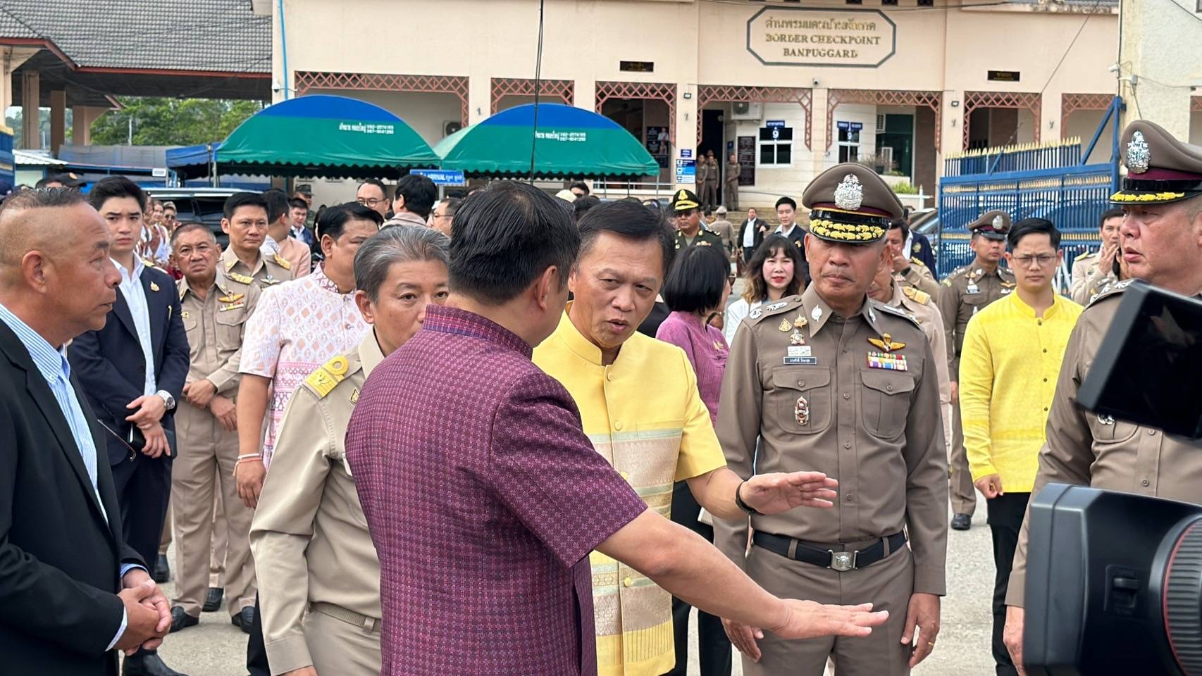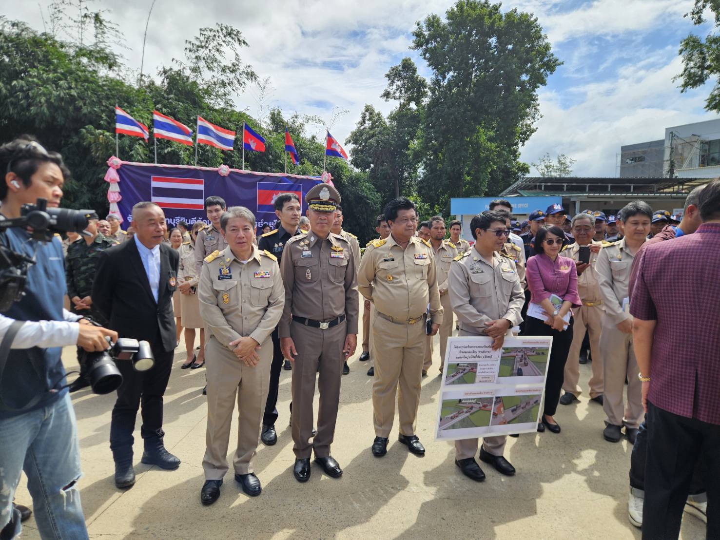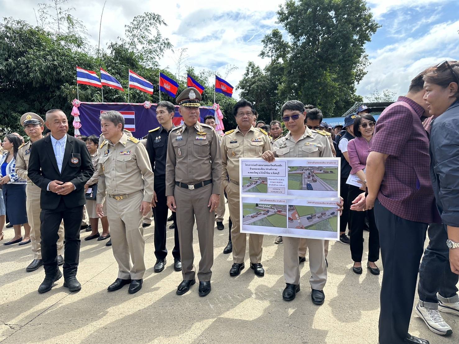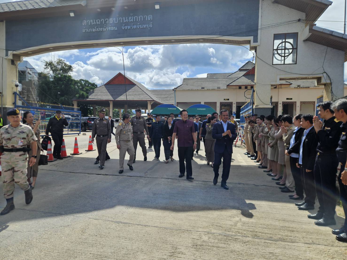 นายมนต์สิทธิ์ ไพศาลธนวัฒน์ ผู้ว่าราชการจังหวัดจันทบุรีพร้อมด้วยคณะ, พล.ต.ต.ผดุงศักดิ์ รักษาสุข ผบก.ภ.จว.จันทบุรี, พ.ต.อ.เฉลิมเดช เฉลิมวงศ์ รอง ผบก.ฯ, พ.ต.อ.วีรยศ การุณยธร รอง ผบก.ตม.2 รรท.ผกก.ตม.จว.จันทบุรี, พ.ต.อ.เสถียร เหลาเกิ้มหุ่ง ผกก.สภ.โป่งน้ำร้อน, ดร.รัฐวิทย์ ตั้งเกียรติพชร ประธานสมาคมการค้าชายแดนไทยกัมพูชา, หัวหน้าส่วนราชการต่างๆ ในพื้นที่จังหวัดจันทบุรี และข้าราชการตำรวจที่เกี่ยวข้อง