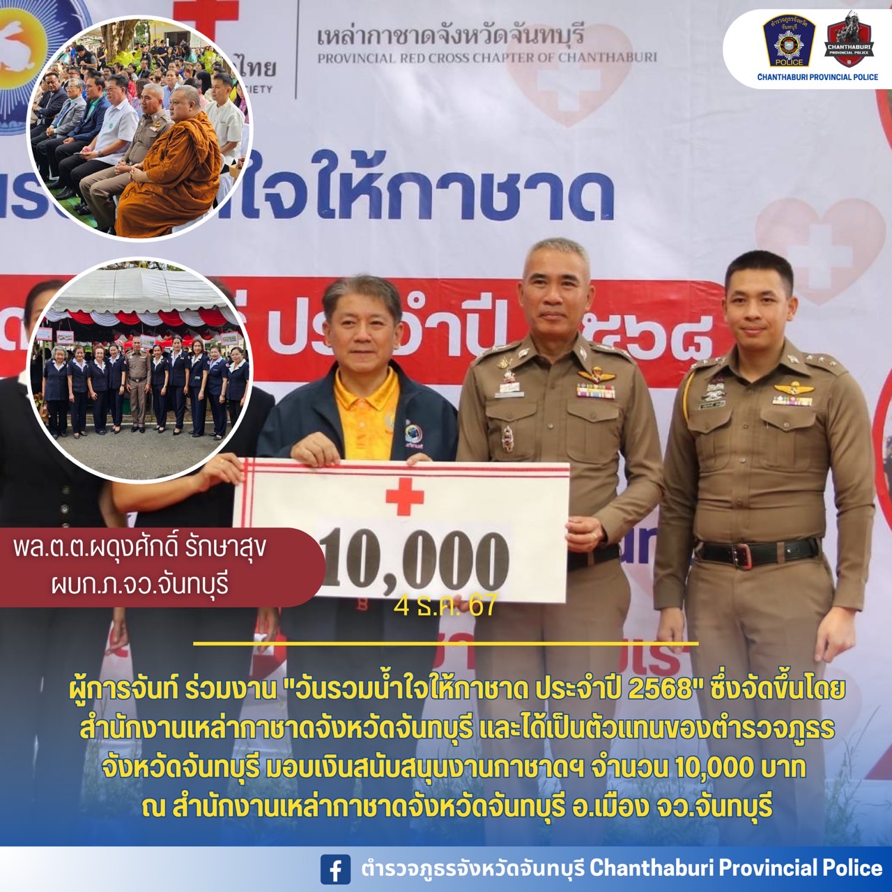 ร่วมงาน “วันรวมน้ำใจให้กาชาด ประจำปี 2568” ซึ่งจัดขึ้นโดยสำนักงานเหล่ากาชาดจังหวัดจันทบุรี และได้เป็นตัวแทนของตำรวจภูธรจังหวัดจันทบุรี มอบเงินสนับสนุนงานกาชาดฯ จำนวน 10,000 บาท
