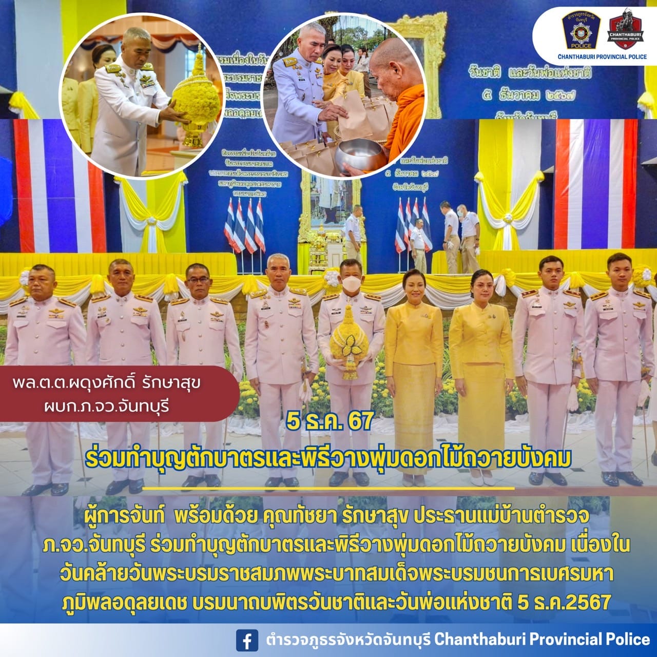พล.ต.ต.ผดุงศักดิ์ รักษาสุข ผบก.ภ.จว.จันทบุรี พร้อมด้วย คุณทัชยา รักษาสุข ประธานแม่บ้านตำรวจ ภ.จว.จันทบุรี ร่วมทำบุญตักบาตรและพิธีวางพุ่มดอกไม้ถวายบังคม เนื่องในวันคล้ายวันพระบรมราชสมภพพระบาทสมเด็จพระบรมชนกาธเบศรมหาภูมิพลอดุลยเดช บรมนาถบพิตร วันชาติและวันพ่อแห่งชาติ 5 ธ.ค.2567