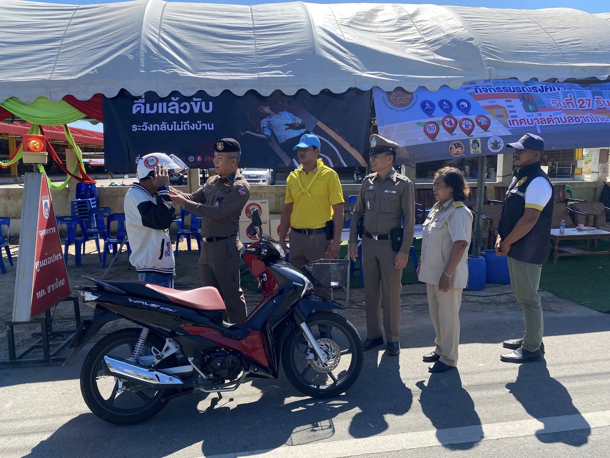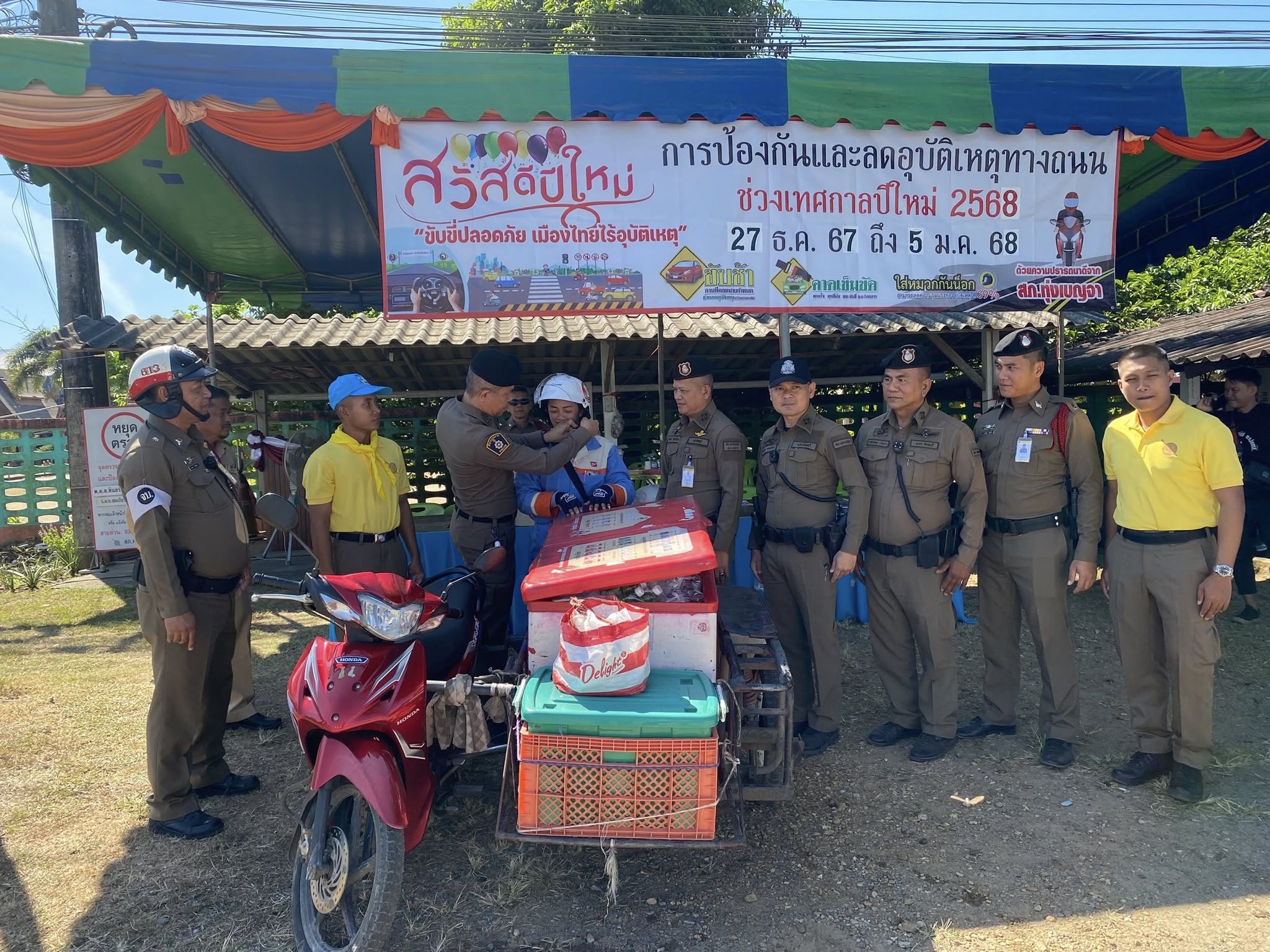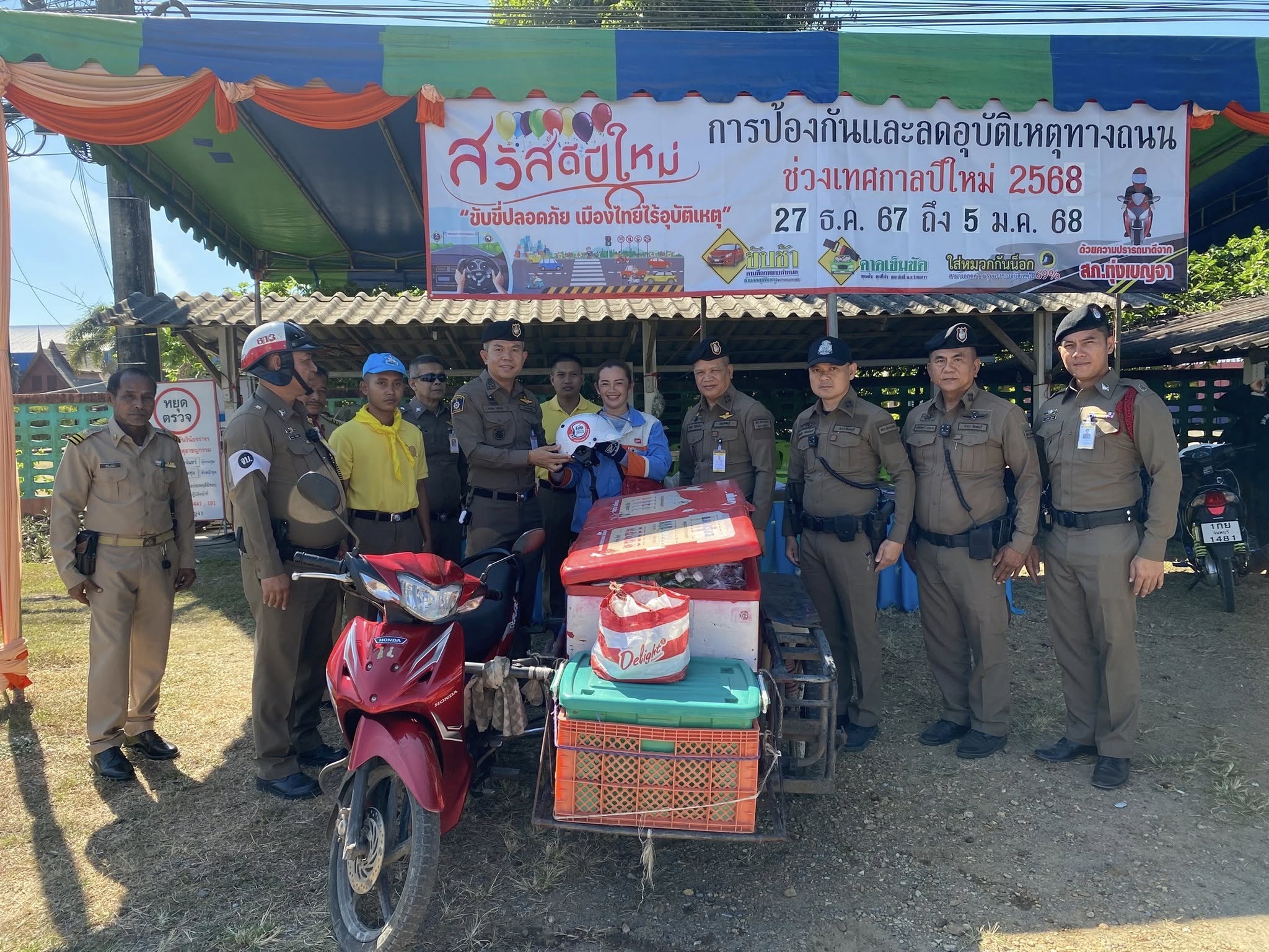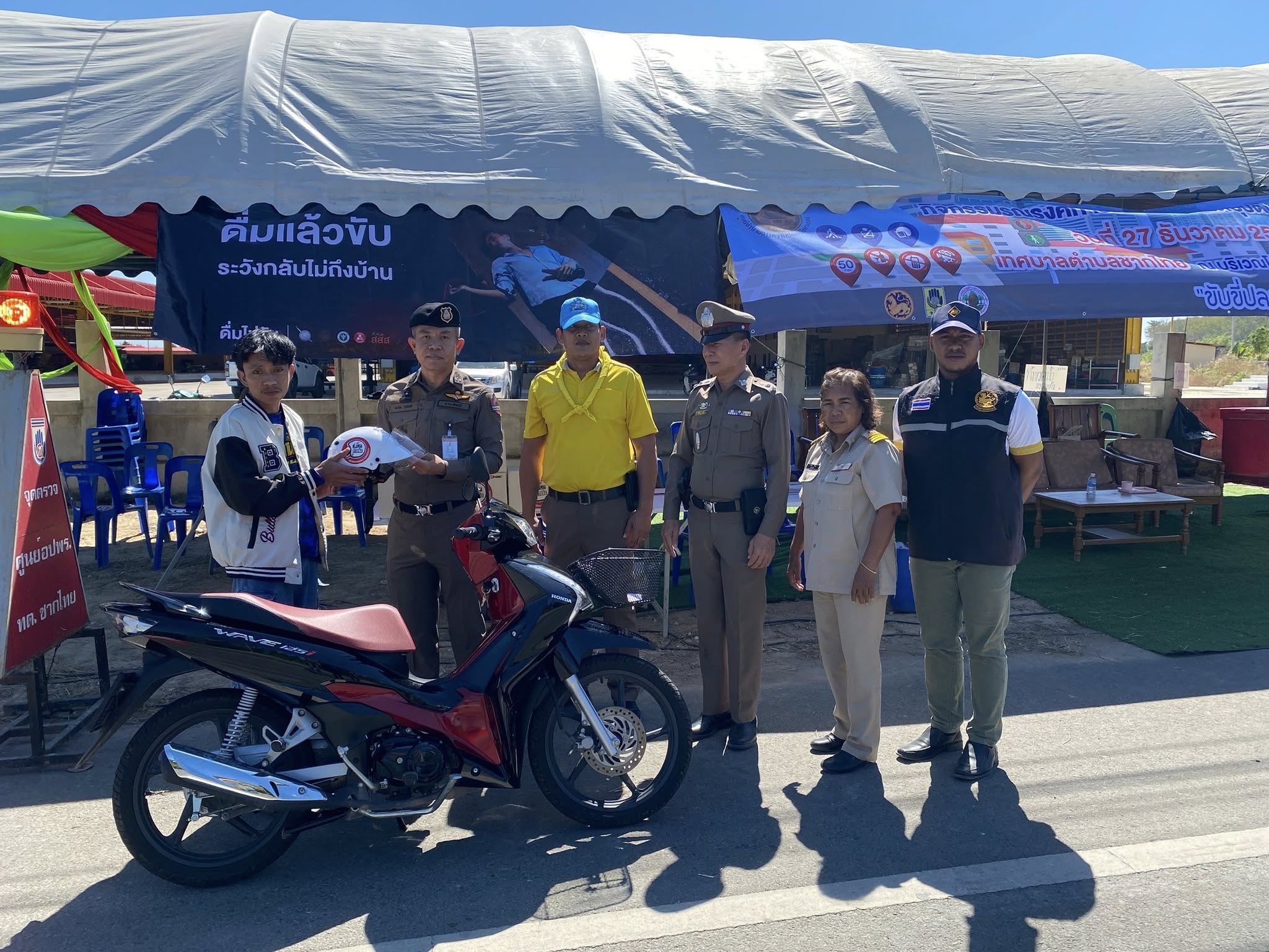 ได้มอบหมวกกันน็อค และร่วมแจกหมวกให้แก่ประชาชนที่สัญจรในเส้นทางพร้อมได้กำชับการปฏิบัติหน้าที่ตามมาตรการที่ผู้บังคับบัญชาสั่งการ และการ