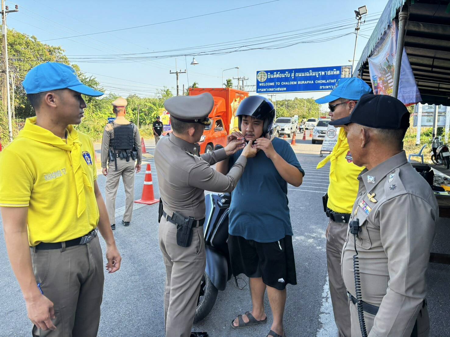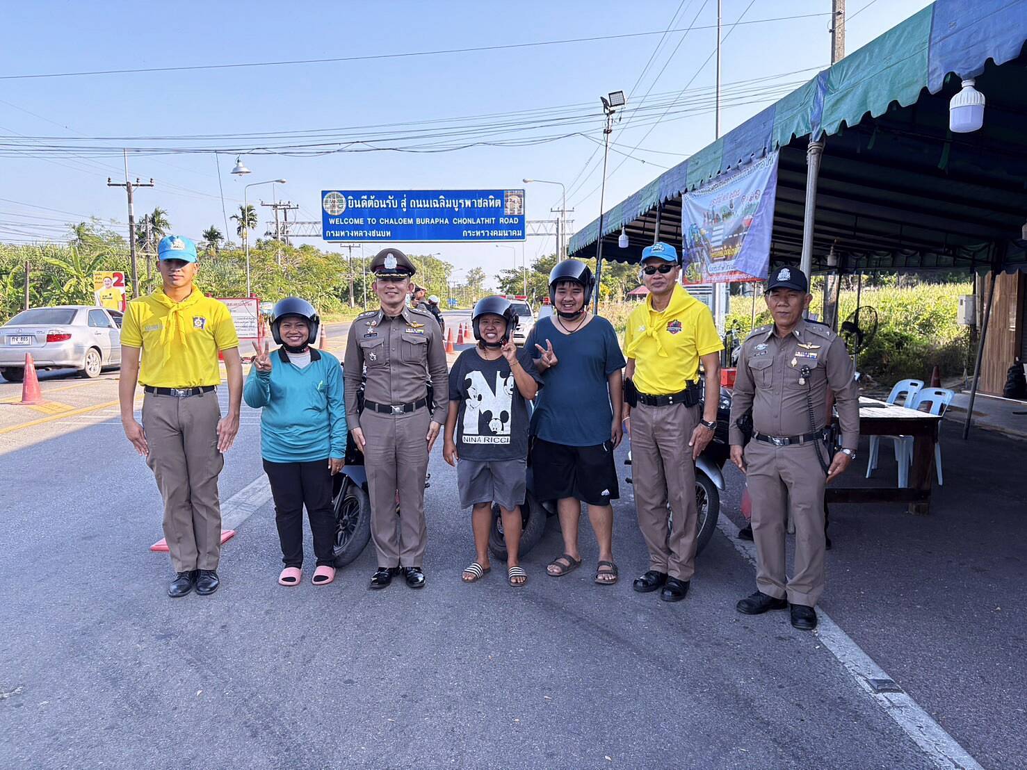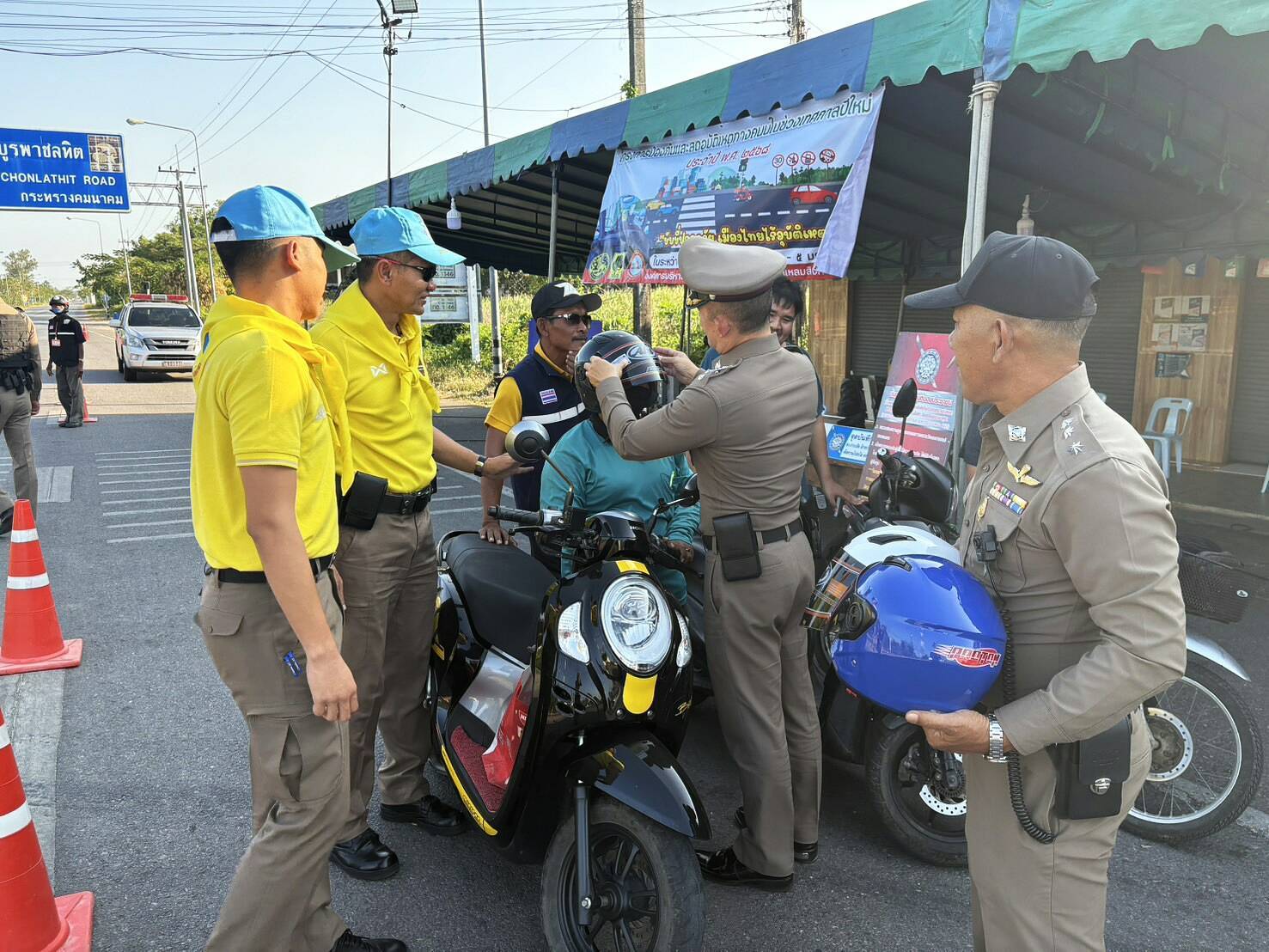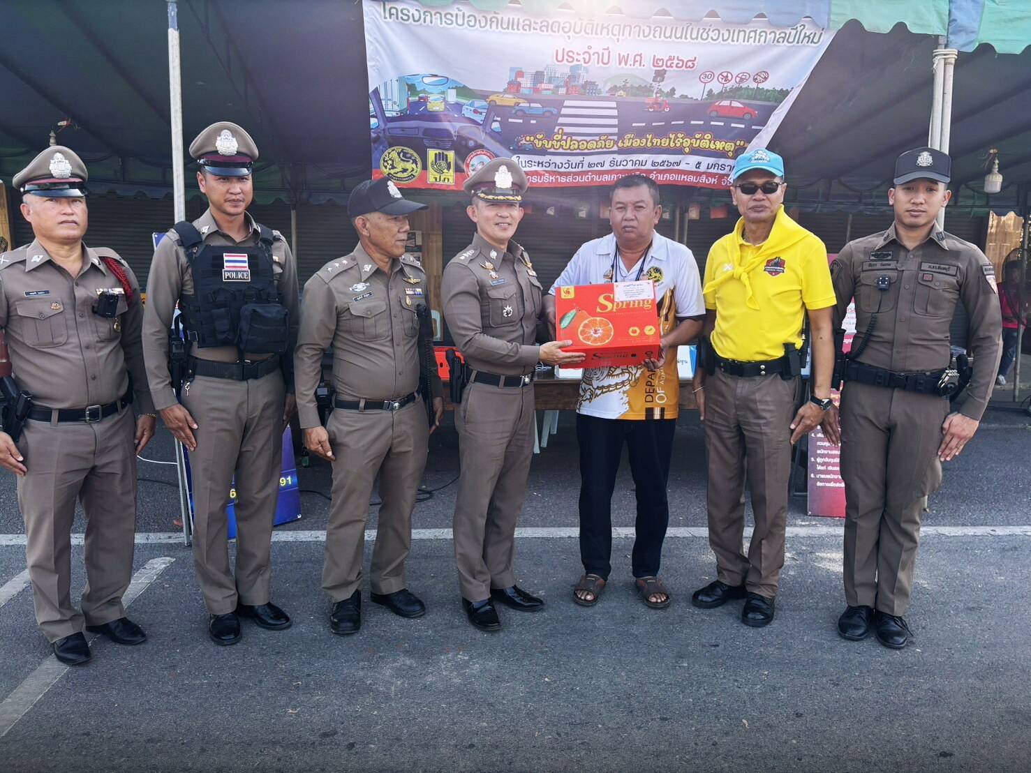 จึงได้กำชับการปฏิบัติหน้าที่ตามมาตรการที่ผู้บังคับบัญชาสั่งการ จนท.ประจำจุดตรวจฯ ทุกนายรับทราบ จึงได้ร่วมกันอำนวยความสะดวกและรณรงค์ประชาสัมพันธ์แก่ผู้ใข้รถใช้ถนน สวมหมวกนิรภัยทุกครั้งเมื่อใช้รถ จยย.เพื่อลดความรุนแรงจากอุบัติเหตุ พร้อมมอบหมวกนิรภัยให้กับผู้ใช้รถเพื่อปลูกจิตสำนึก ก่อนออกเดินทาง ว.4 พื้นที่อื่น ได้มอบผลไม้ไว้ให้รับประทานเพื่อเป็นขวัญกำลังใจ