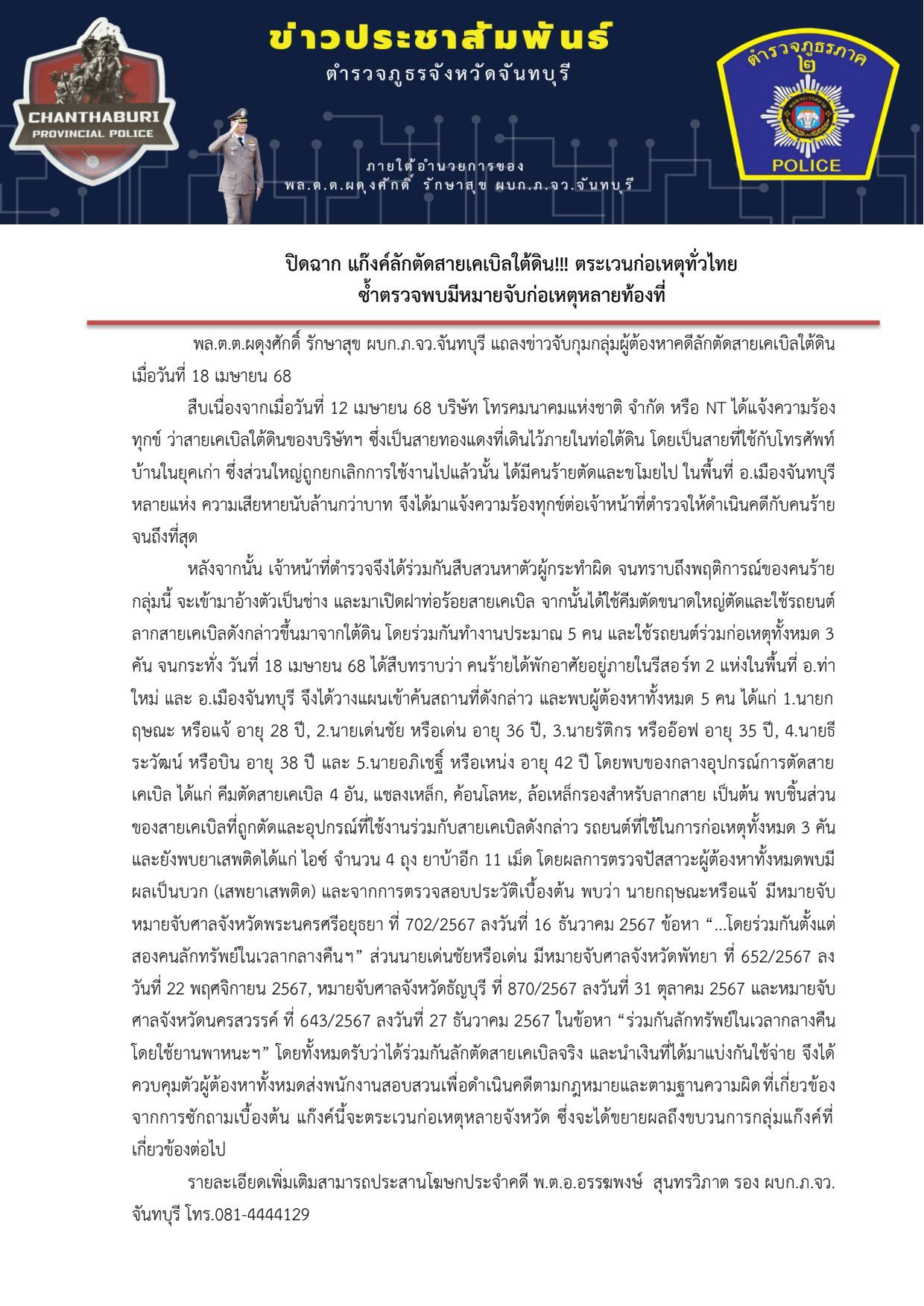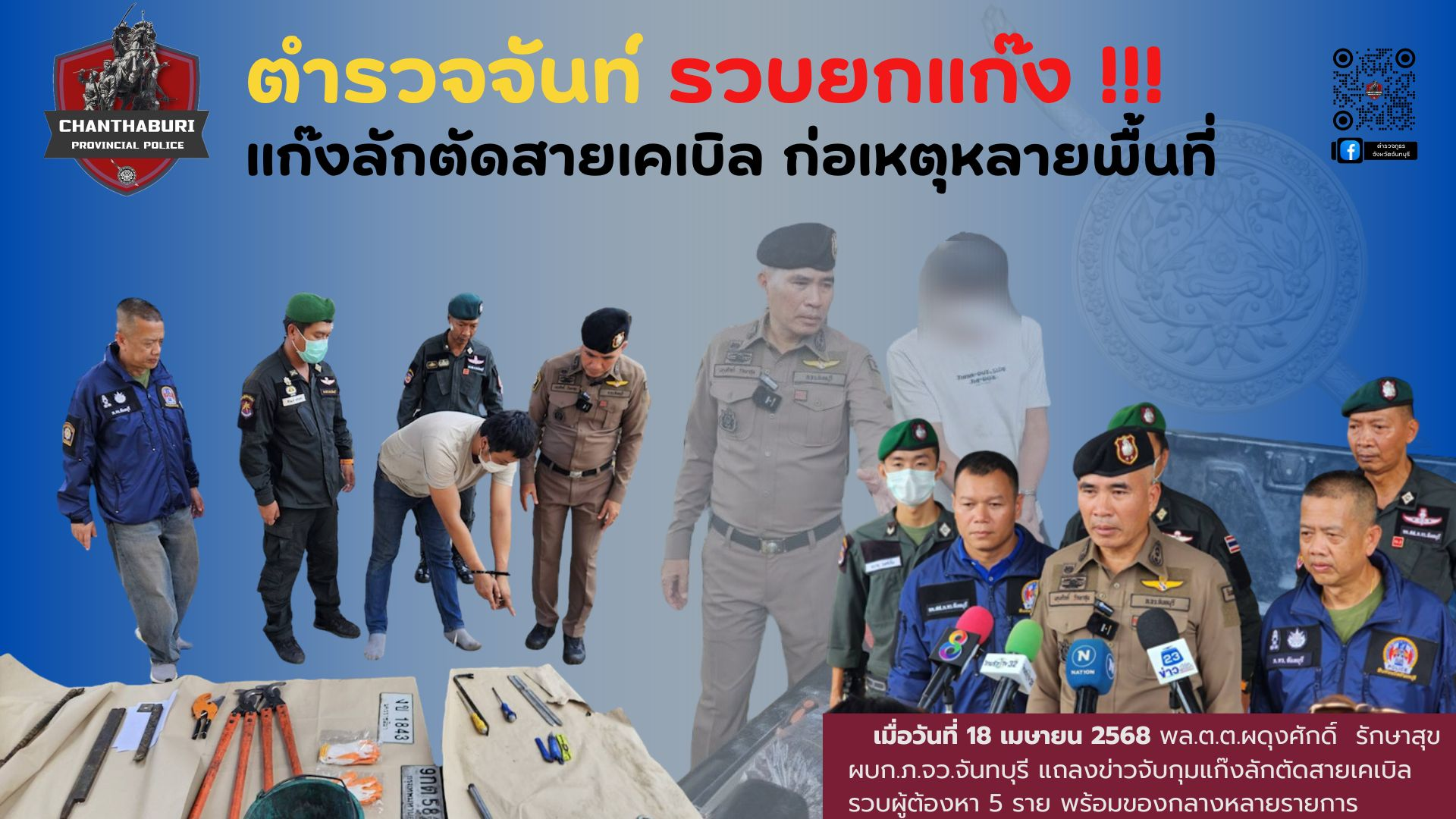 พฤติการณ์ : กลุ่มผู้ต้องหาตระเวนก่อเหตุลักลอบตัดสายทองแดงใต้ดิน ในหลายพื้นที่ เช่น ชลบุรี, อยุธยา, ปทุมธานี ฯลฯ โดยมีการแบ่งหน้าที่กันทำ เช่น ทำหน้าที่ดูต้นทาง, ทำหน้าที่ตัดสายไฟ, ทำหน้าที่ขนสายไฟ โดยเข้ามาก่อเหตุในพื้นที่ ต.ท่าช้าง อ.เมือง จ.จันทบุรี เมื่อวันที่ 12 – 13 เม.ย.68 ได้สายไฟไปจำนวนมาก หลังจากนั้นนำสายไฟไปขายและนำเงินที่ได้มาแบ่งกัน โดยสามารถจับกุมกลุ่มผู้ก่อเหตุได้ 5 คน ดังนี้