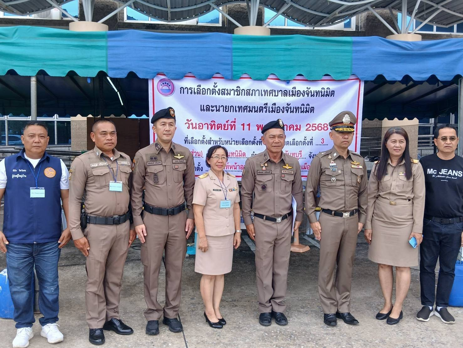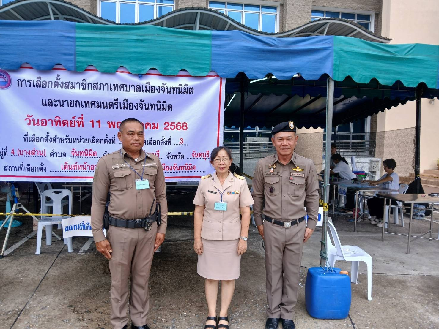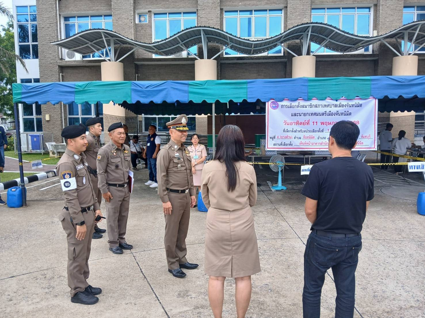 พล.ต.ต. นันทวุฒิ สุวรรณละออง รอง ผบช.ภ.2 พร้อมด้วย พ.ต.อ.เฉลิมเดช เฉลิมวงศ์ รอง ผบก.ภจว.จันทบุรี, พ.ต.อ.เสกสรรค์ ศรีเพริศ ผกก.สภ.เมืองจันทบุรี ตรวจเยี่ยม หน่วยเลือกตั้ง 1 เขตเลือกตั้งที่ 3 เต็นท์หน้าอาคารสำนักงานเทศบาลเมืองจันทนิมิต อ.เมือง จ.จันทบุรี